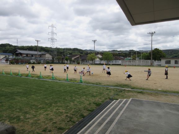 休み時間に自然発生的に異学年ドッジボールが始まっています。2〜6年生のドッジボール好きの子どもたちが、一緒に楽しんでいます。上田上小学校ではおなじみの光景ですが、学年関係なくみんなで遊べるこの雰囲気がよさの1つと言えるでしょう。