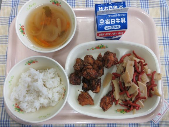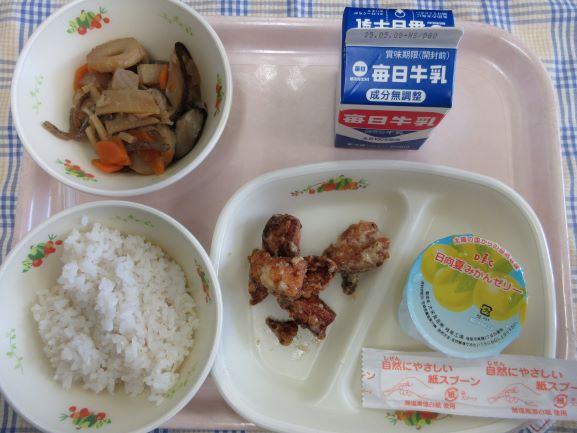 宮崎県にゆかりのあるメニューでした。タルタルソースのかかった鶏の唐揚げ(チキン南蛮)は子どもたちにも人気だったようです。ごちそうさまでした。