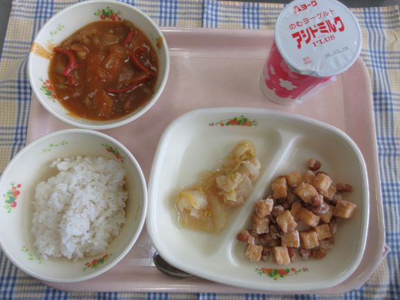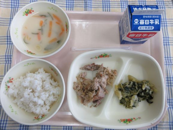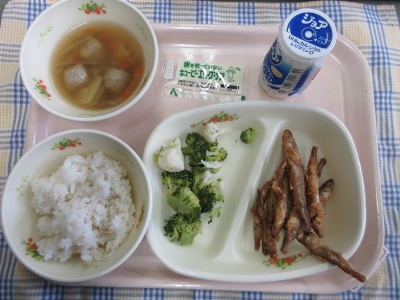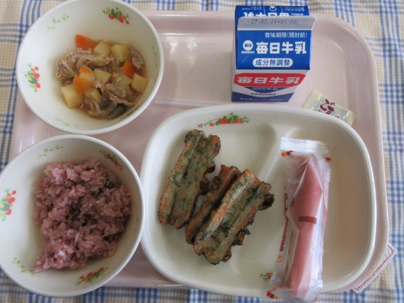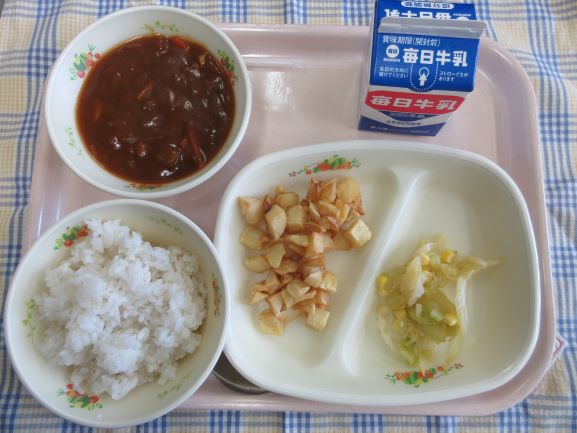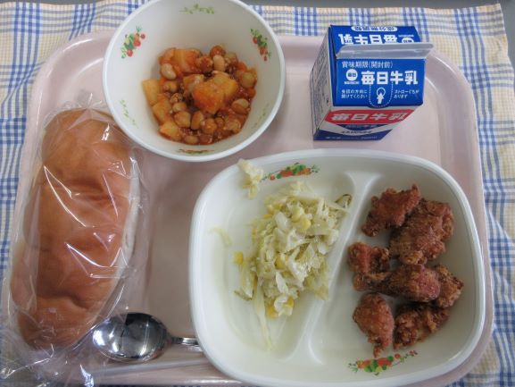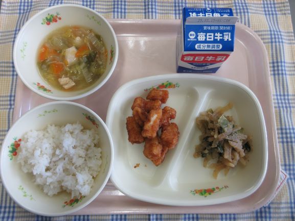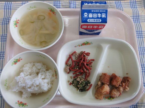 昨日に引き続きから揚げが出て子どもたちはうれしそうです。味付けに変化をつけてくださっており、飽きがこないように工夫してあります。今年度の給食も今日を含め4日。ありがたくいただきます。