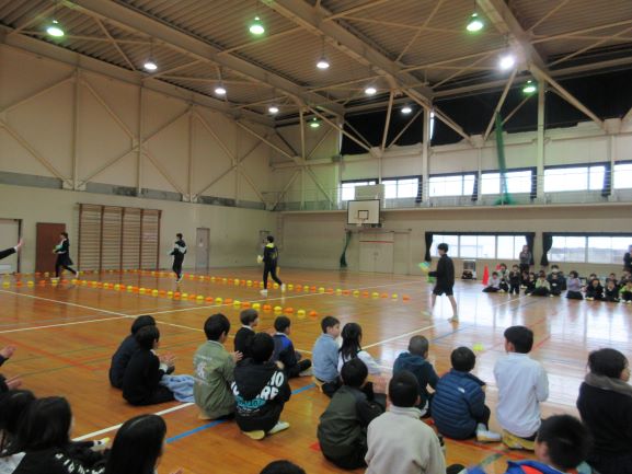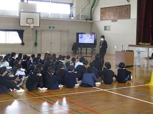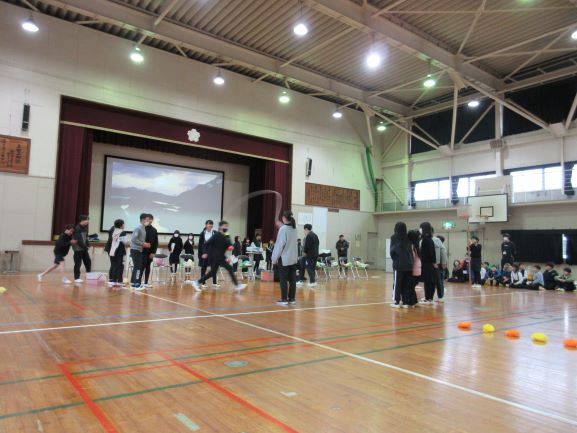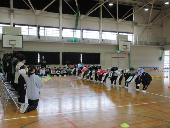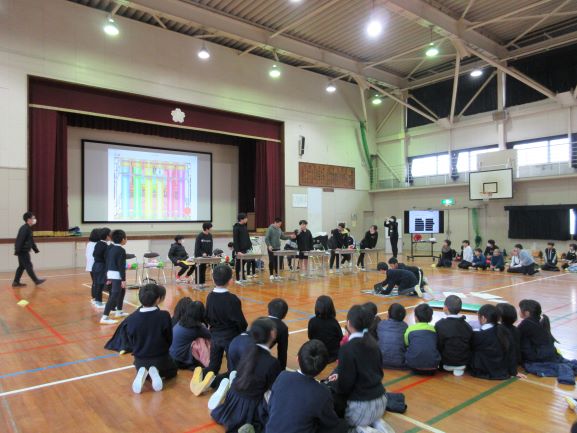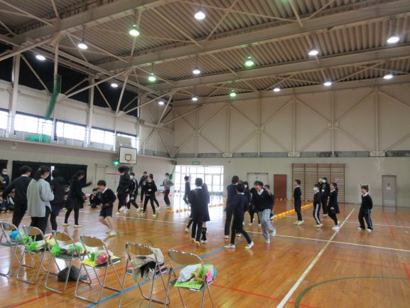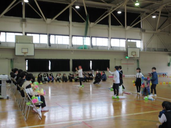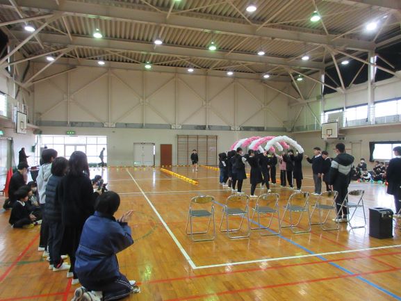 3年生は6年生に大縄(8の字跳び)の挑戦をしました。3分間でどちらが多く跳べるか?結果は6年生の勝ちでしたが、3年生もいい勝負でした。4年生は人気クイズ番組になぞらえて、6年生にクイズを解いてもらいました。6年生は6人ずつ2チームに分かれてクイズに解答しました。結果は引き分けでした。制限時間が迫ってくると、周りで見ていた他の学年も、「がんばれ!」と応援していました。