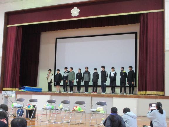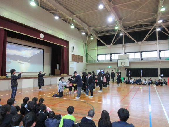 最後の出し物は6年生からでした。全員で創作したミニ映画を上映してくれました。冒険をして敵と戦いながら宝を探しに行き、最終見つけた宝は、在校生へのメッセージ、という内容でした。メッセージは直接6年生が1人ずつ、各学年の子どもたちへ話してくれました。それぞれの学年のこの年のがんばりをしっかり見つけてくれていて、温かい言葉で励ましのメッセージを伝えていました。在校生は静かに聴き入っていました。最後は6年生の退場をみんなの拍手で見送りました。6年生はもちろん、全校全員1人ひとりに持ち場があり、活躍できたよい集会になりました。