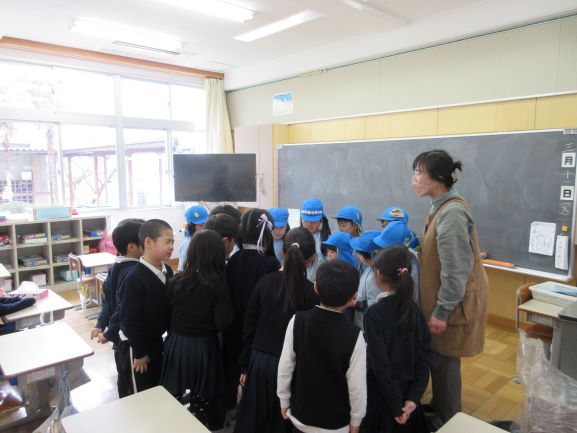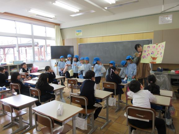 1年生が1年間ずっと交流してきた上田上幼稚園の5歳児さん。「さくら会」という名前でほぼ毎月お互い訪問し合って、さまざまな活動を一緒にしてきました。今日は雨の降る中、「お礼のメッセージ」を持って、学校を訪ねてくださいました。1年生の子どもたちは大喜び。メッセージをいただいた後、「ありがとうございます!4月からがんばってね!」とお礼とエールを送りました。傘が見えなくなるまで、園に帰っていく5歳児のお友達を見送っていました。上田上小学校に入学してくれるお友達は、また4月から一緒に過ごせますね。待っています!
