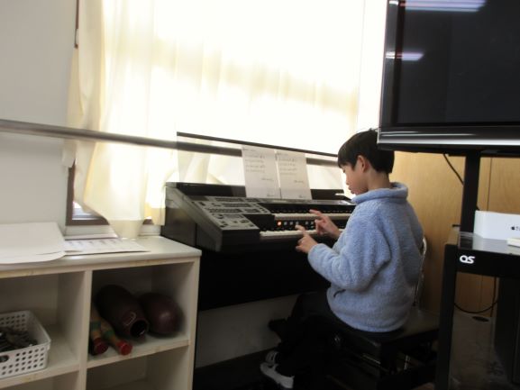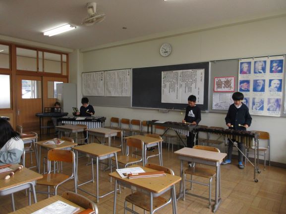 演奏を聴いてほしい!と誘いに来てくれた4年生の子どもたち。音楽室で「オーラリー」のリコーダー奏と「茶色のこびん」の合奏をしていました。特に「茶色のこびん」は軽快なリズムを体で感じながら、とても楽しそうに演奏していました。みんなで音を合わせるのっておもしろい!ですね。これからも音楽を楽しんでいってほしいなと感じました。