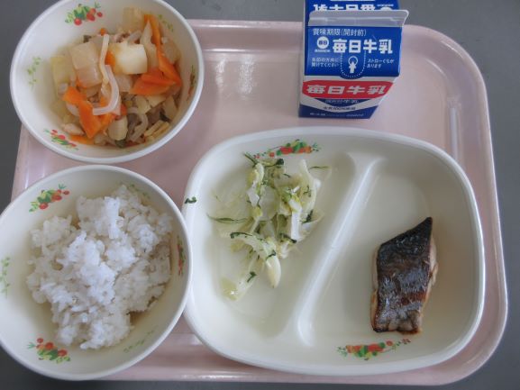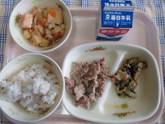 和歌山県だけでなく奈良県も梅の産地だそうです。今日の豚肉には焼いた後、梅のたれをかけてくださっているということでした。普段はあまり口にする機会の少ない郷土料理がいただけるのも給食のよさですね。ありがたくいただきます。