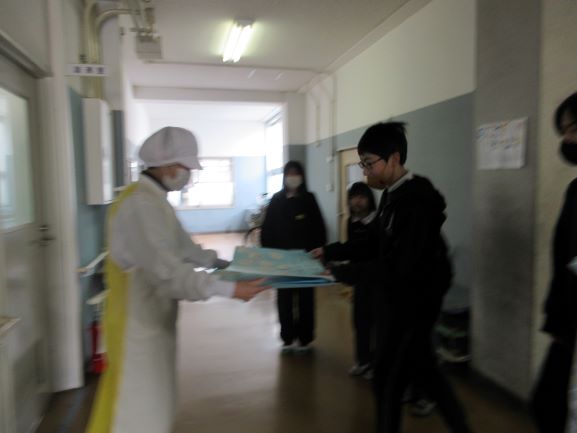 今日が今年度最後の給食になります。明日、卒業する6年生のお祝い献立として、お赤飯やケーキなどごちそうを用意してくださいました。小学校で食べる最後の給食、6年生は特に味わって食べていました。また、全校1人ずつから集めた、配膳員の方へのメッセージを体育食育委員会の子どもたちが渡しにいきました。1年間お世話になった給食関係者のみなさま、ありがとうございました。