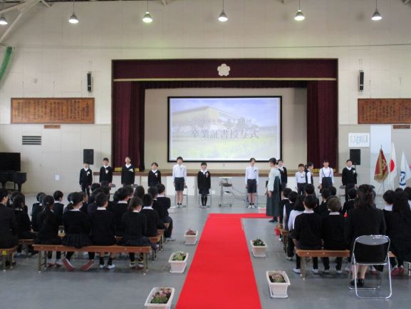 6年生12名が本日卒業式を無事終えました。立派なふるまいで卒業証書を受け取り、在校生とのよびかけや歌も練習以上の力を出し切りました。1年から5年生の在校生や地域からのご来賓の皆様は6年生との別れを惜しみ、保護者の方々はお子様の晴れ姿に涙ぐんだり、記念写真をたくさん撮ったりされていました。全校みんなで6年生の門出をお祝いできたよい式になりました。6年間、上田上小学校で成長された皆さんおめでとうございました。またお忙しい中、駆けつけてお祝いくださった保護者・地域の皆様本当にありがとうございました。