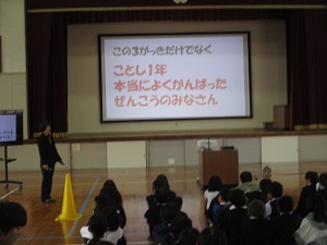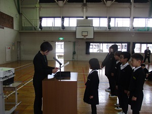 修了式では、各クラスの代表が校長先生より修了証を受け取りました。受け取った後5年生の人が代表で今年度がんばったことや来年度に向けての抱負を話してくれました。校長先生から、3学期の全校児童のがんばりや成長についてのお話がありました。また、子ども支援コーディネーターの先生から、春休みのくらしについてお話を聞きました。全校の皆さんと4月9日に元気に会えるのを楽しみにしています。保護者の皆様、地域の皆様、1年間お世話になりありがとうございました。来年度もよろしくお願いします。