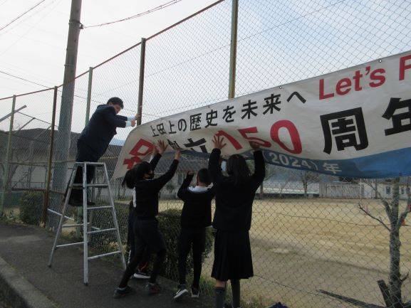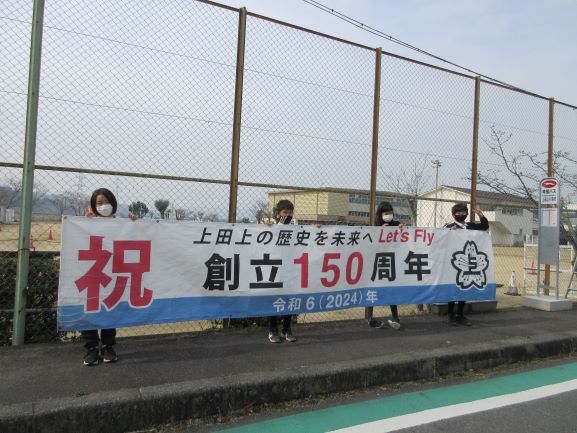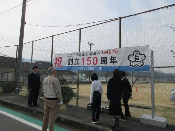 修了式のあと、5年生児童会の子どもたちと地域の方々が一緒に、「創立150周年」の横断幕の除幕を行いました。令和5年度当時の6年生が中心になって「上田上の歴史を未来へ Let's Fly」というスローガンを考えてくださったということで、2年間ずっと運動場横のフェンスに掲げられていたものです。横断幕は近くで見ると結構ひび割れなどが有り、2年間の時間の重みが感じられました。子どもたちの手できれいに畳まれた横断幕は、200周年のときに開封される予定のタイムカプセルに同封することになりました。今日、除幕をしてくれた子どもたちは50年後還暦を越えている計算になります。そのときに今日のことを思い出してくれるかも知れません。大事に記念に残していきます。