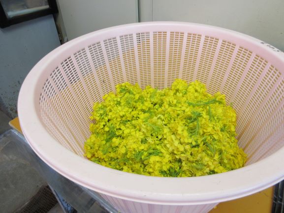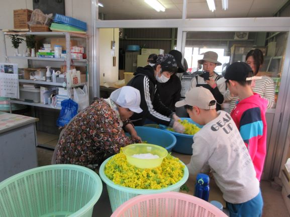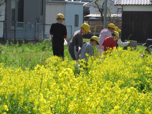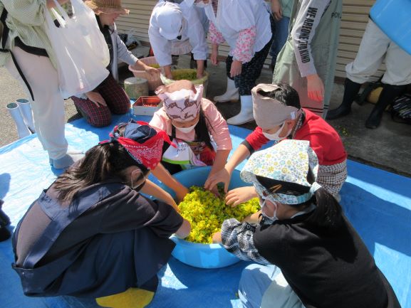 昨年度3年生が菜の花漬け体験のため、地域・保護者の方々と一緒に植えて育ててきた菜の花が育ってきたので、今日は朝から有志の保護者の方と子どもたち、そして教職員で菜の花摘み、菜の花漬け込みをしました。農工房ひらのの方に教えていただきながら、みんなで摘んだ花を花の重量の8%にあたる塩と混ぜ、鷹の爪と一緒に樽に漬けました。来週4年生の子どもたちが菜の花漬け体験をさせていただく予定です。本日ご協力くださった地域・保護者の皆様ありがとうございました。今後ともどうぞよろしくお願いいたします。
