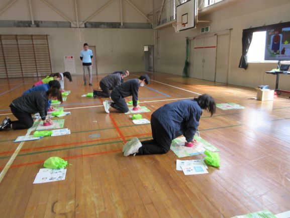 5年生は、手に玉を1つ持ち、大縄を跳んだ後、担任の先生のクイズに答えて、玉入れの籠に玉を投げ入れる、という競技を6年生と競いました。クイズに正解すると、玉がもう1つもらえて、籠に投げ入れるチャンスが2倍になるというルールです。最初に5年生がチャレンジし、その後6年生が挑戦しました。結果は僅差で5年生の勝利でした。その後、5年生が全校に呼びかけて作成した色紙を6年生1人ひとりに手渡しました。全学年の子どもたちが6年生のいずれかのメンバーにあてて書いたメッセージがびっしりと貼られています。6年生はたからものを見るかのようにメッセージに目を通していました。