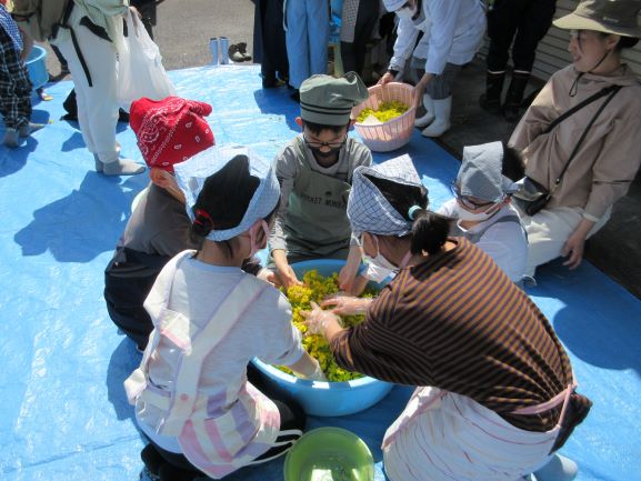 昨日までの雨が止み、予定通り菜の花摘み・菜の花漬けの体験学習ができました。農工房ひらのの4名の方々と保護者・地域の方も多数来てくださり、4年生と一緒に菜の花摘み・菜の花漬けを行ってくださいました。1週間前に保護者の方や職員で花を摘んで11sの菜の花漬けを仕込みましたが、今日、菜の花はまた満開になっており、その花の強さ、生命力に驚かされました。子どもたちと大人みんなで摘んだ花は16.5sあり、7回に分けて塩と混ぜ込み、樽に漬けていきました。子どもたちがさくさく作業を進められたので、スムーズに仕込めました。お手伝いくださった農工房、保護者、地域のみなさま、本当にありがとうございました。保護者の方々には10月末くらいにお漬け物が仕上がるため、いろいろ手をかけていただくことになります。どうぞよろしくお願いいたします。