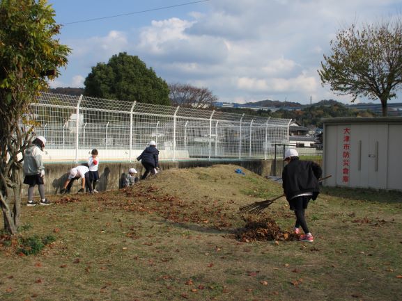 一斉清掃にちなんで5校時目に全校で落ち葉拾いをしました。くまでや竹箒などで集めたり、手で拾ったりして、ゴミ袋11枚分の落ち葉を回収しました。みんなで過ごす学校をみんなできれいにする活動に一生懸命取り組めました。
