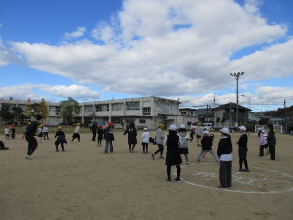 体育食育委員会が全校昼休み遊びを企画しました。縦割り班4チームが2チームずつ対抗で「王様とり」をしました。相手チームの人にタッチされるとその場でじゃんけん、負けた人は自分たちの王様に助けてもらえるまで動けないというルール。相手チームの王様は誰かを見抜き、その人をタッチしてじゃんけんに勝ったチームの勝ちになります。どのチームも王様が誰かわからないように工夫しながら戦いました。タッチされて「助けて〜」と王様を呼び続けたり、タッチする瞬間を待ち伏せして王様を割り出そうとしたり、それぞれが楽しんで参加していました。全校で遊ぶことができる上田上小学校のよさを感じる時間でした。