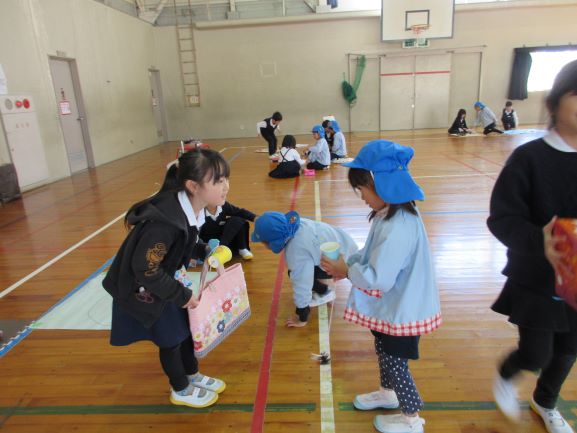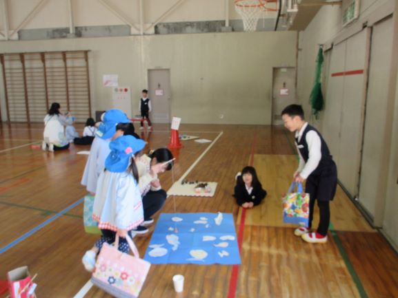 上田上幼稚園5歳児さんと1年を通じて交流会をしているさくら会。今日は1年生の子どもたちが秋の木の実や空き容器・箱などを活用してつくったおもちゃランドに、幼稚園のお友達を招待しました。すごろく・めいろ・おみくじ・射的・さかなつり・三目ならべの6つの遊びコーナーをつくり、幼稚園のお友達に遊んでもらいました。遊び方の説明をしたり、うまくできると景品を渡したりして、少しでも楽しんでもらおうと工夫していた1年生たち。とてもよくがんばっていました。