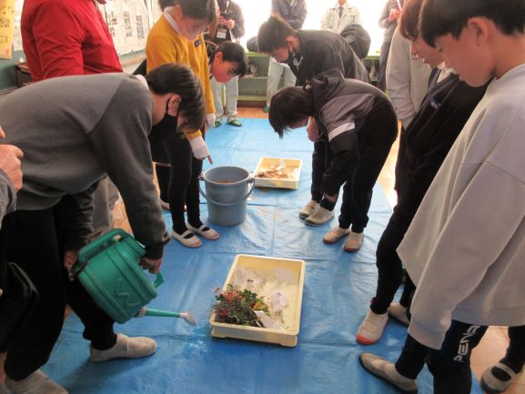 大鳥居へ卒業記念植樹に行く前に、砂防とは何か、何のために植樹をするのか、などについて学習をしました。地域の古市さんと岩ア先生に授業をしていただきました。植樹をすることでどれだけ砂の流出に効果があるのかを、実際に小さな山をつくり、水を流して実験をしました。苔や枝を木に見立て、砂山に盛った方は水を流してもあまり砂の流出はありませんでしたが、ただの砂山は水と一緒に砂が流れ出てしまいました。植樹の意味を体験を通して学びました。