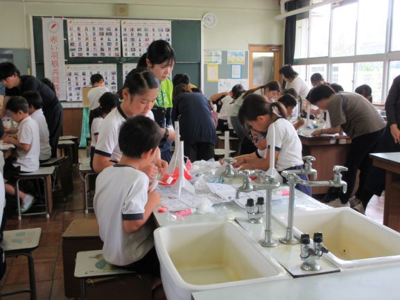 認定NPO法人くさつ未来プロジェクトの方々のサポートをいただき、150周年記念も兼ね、ロケットづくり体験をしました。最初にこのプロジェクトの創始者の方のメッセージ動画を全校で視聴し、その後、高学年、低学年に分かれて各自ロケットをつくりました。友だちと教えあう姿や完成して嬉しそうな笑顔になる姿が見られ、良い体験ができました。明日5校時に運動場で4機ずつ打ち上げをする予定です。