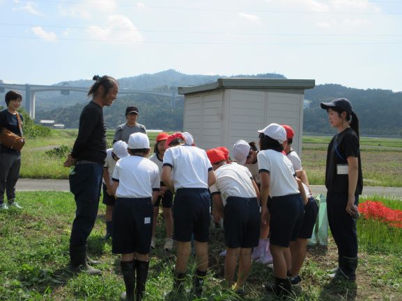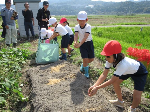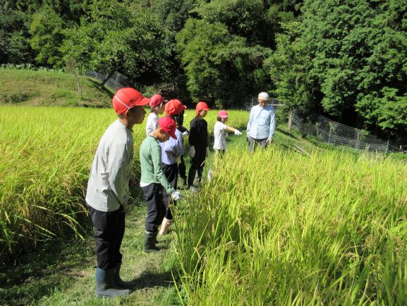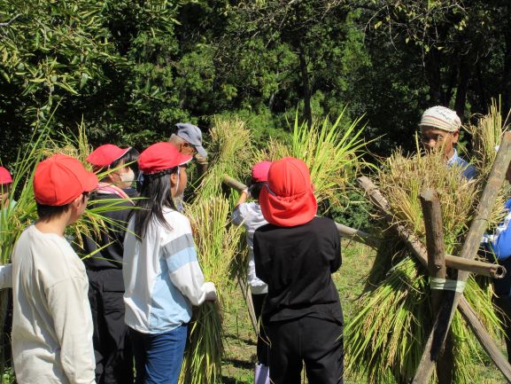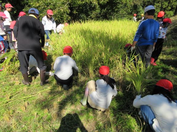 秋晴れのもと、5月17日に植えた里山の田で稲刈り体験をさせていただきました。小さな早苗が生長し、黄金色に実り穂を垂れていました。子どもたちは説明を聞いて、稲の根元をしっかり支えて鎌で1株ずつ刈り取っていきました。その後、束ねた稲をみんなで干す作業をしました。「米を一粒も無駄にしたくない」と言いながら、最後まで落ち穂拾いをしている子もいました。また、稲刈りがとても楽しく、もっと刈りたいと言っている子もいました。お世話を続けてくださった古市様、岩ア先生ありがとうございました。