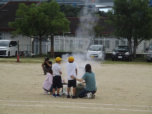 家庭科室から出火した想定で避難訓練をしました。おさない、はしらない、しゃべらない、もどらないの約束を守って真剣に訓練に取り組むことができました。
