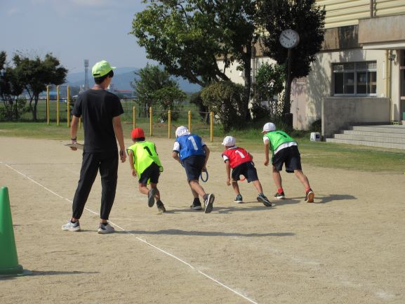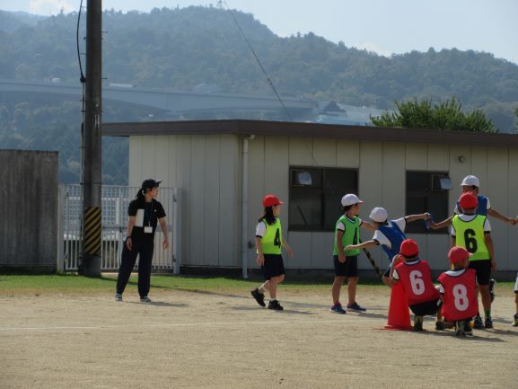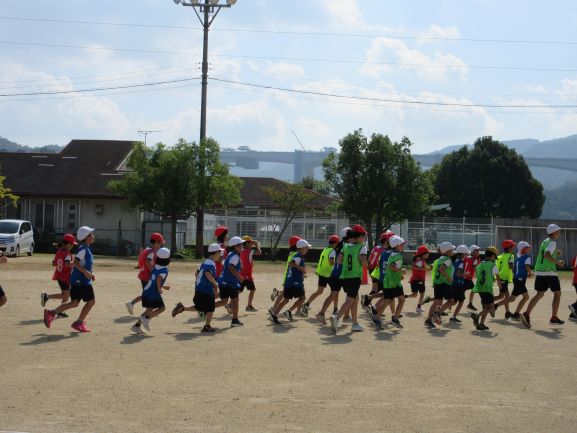 今年度も児童会種目は全員リレーです。1〜6年生の混合4チームに分かれて2チームずつ2試合行います。初めての練習でしたが、並び方や自分の順番などについて確認しながら、2レースを行いました。今日の練習がスムーズに進んだので、本番は自信を持って走ることができると思います。暑い中、みんなよくがんばりました!