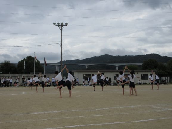 高学年の演技の様子です。前半は静かな波から始まり、勇壮なロックソーランへと変化しました。後半は組体操の発表で、1人技から最後のクイックピラミッドまで、静と動を組み合わせたプログラムでした。「真剣・辛抱・信頼」を合い言葉に取り組んできた練習の成果を全員で成し遂げたすばらしい発表でした。