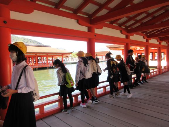 10月22日・23日の1泊2日で、6年生が広島・宮島に修学旅行へ行きました。1日目は原爆ドームを見たり、被爆体験伝承講話を聴いたり、ボランティアガイドさんに平和祈念公園内を案内していただいたりして、原爆や平和などについて理解を深めました。平和の子の像の前で平和の集いも行いました。2日目は宮島に移動し、世界遺産の厳島神社を見学したり、宮島水族館鑑賞やお土産選びなどを楽しみました。お天気にも恵まれよい2日間を過ごすことができました。ご協力くださった保護者のみなさまありがとうございました。