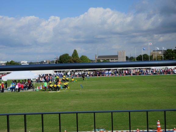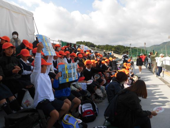 全校でフライングディスクの応援に行きました。場所は水口スポーツの森です。さまざまな県から選手がきておられ、応援席からみんなで声を出したり拍手をしたりして観戦しました。沖縄県の選手の方は本校応援席前を通りがかると「イーヤーサーサー!」「アイーヤ!」などと声をかけてくださり、みんなでレスポンスコールをして盛り上がりました。滋賀県代表の方の応援ももちろんしました!