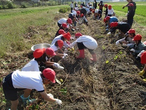 スクール農園に5月に植えた さつまいもが、収穫を迎えました。縦割り班ごとに協力して掘りました。今年は、昨年よりたくさん収穫できました。11月に焼き芋ができそうです。お楽しみに☆
