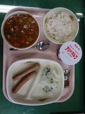 「おすすめカレー・残さず食べようデー」麦ごはん、飲むヨーグルト、フランクフルト、長等小学校おすすめカレー、大根サラダ、しそドレッシング
