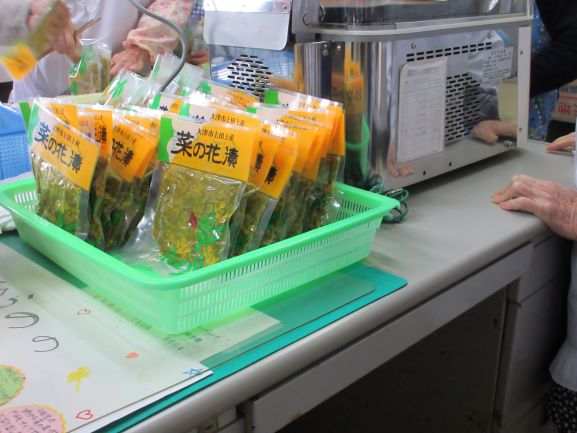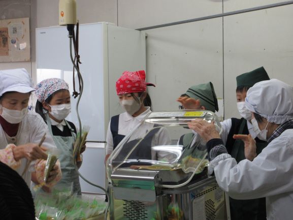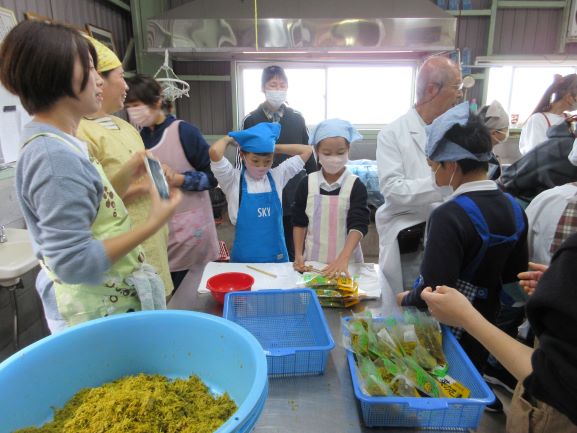 今年度初めに4年生が漬けた菜の花漬けが仕上がり、農工房ひらのの方のご協力と菜の花会保護者の方のご尽力をいただきながら、4年生がお漬け物をパックに詰めました。工房の中は発酵したお漬け物の香りが満ちていて、子どもたちは1パックずつ、内容量を量りで確認しながら交代で作業しました。今年度は菜の花会の方が漬けられた分も含め、30sもあったので、たくさん完成品が並びました。ここまでお力添えくださった地域・保護者の皆様、本当にありがとうございました。