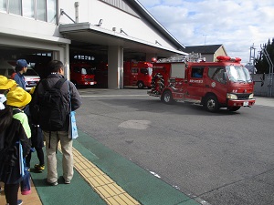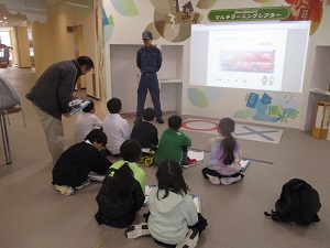3年生は、大津市の北消防署を訪れて、消防や救急の仕事について学びました。○×クイズやけむり体験などもしていただきました。24時間体制で、消火や救助に、出動されることがわかりました。消防署にいる間も、何度も連絡があり、すぐ出動される場面も見られました。おいそがしい中ありがとうございました。