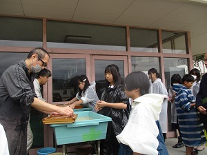 桐生の成子紙工房から、職人さんが来てくださり、6年生が紙漉き体験をしました。お話を聞いた後、一人ひとり紙漉き体験を行いました。卒業証書と色紙用の和紙の二種類を制作しました。できあがりが楽しみです。