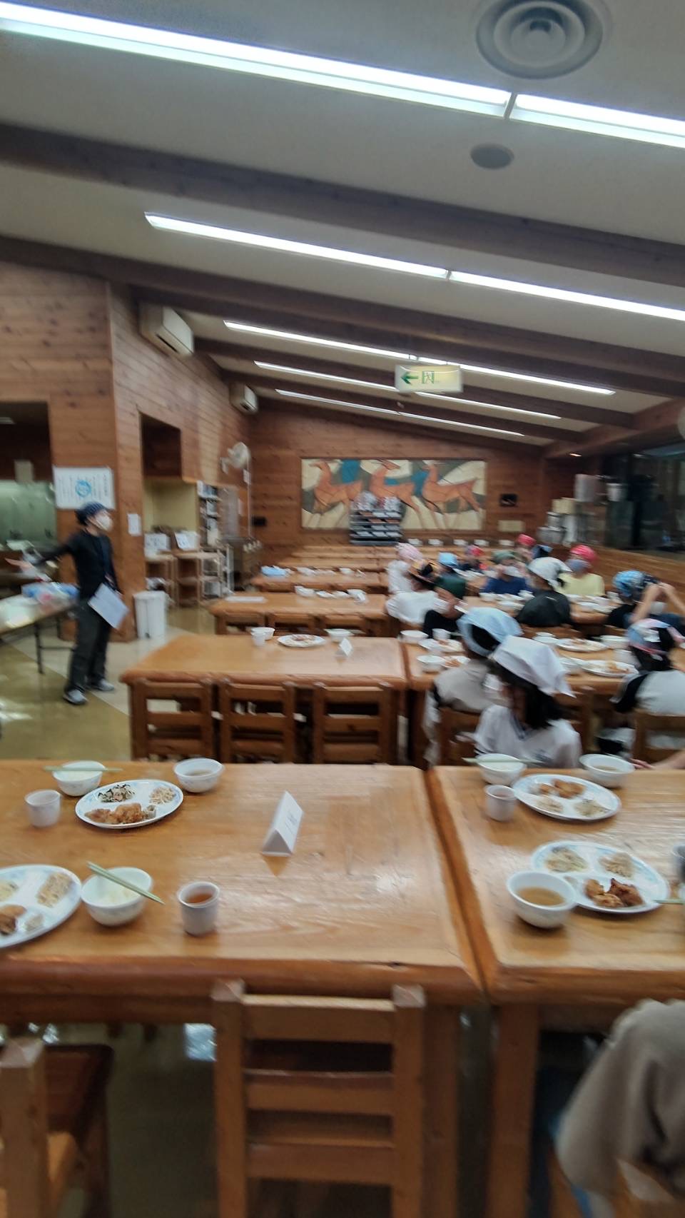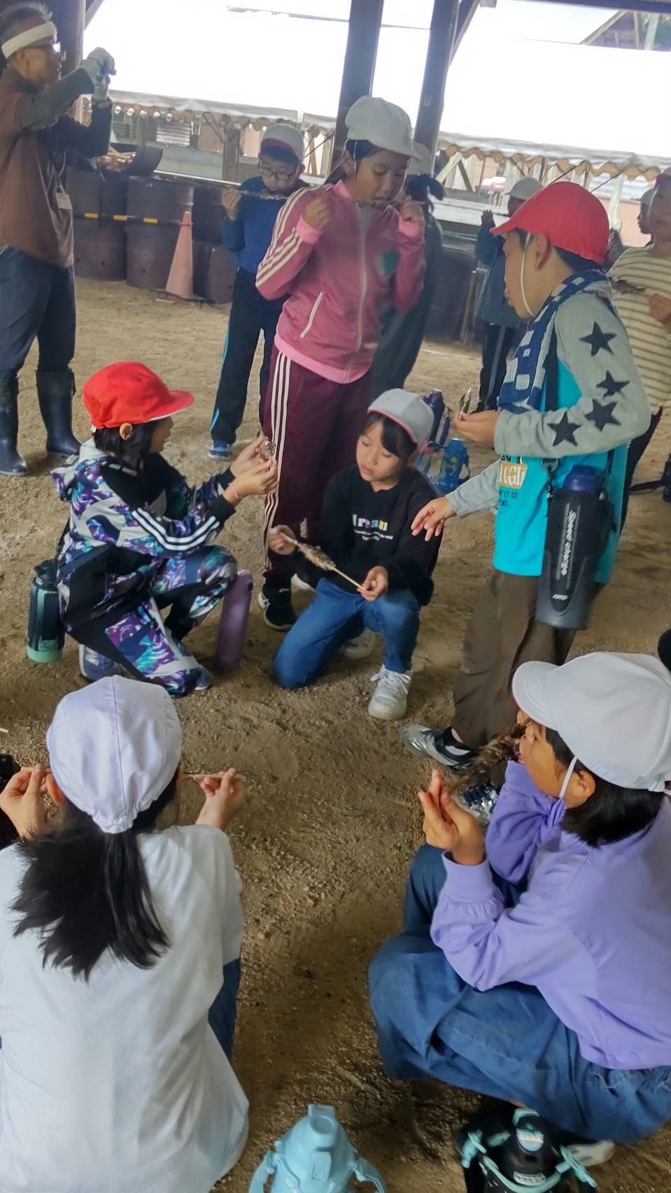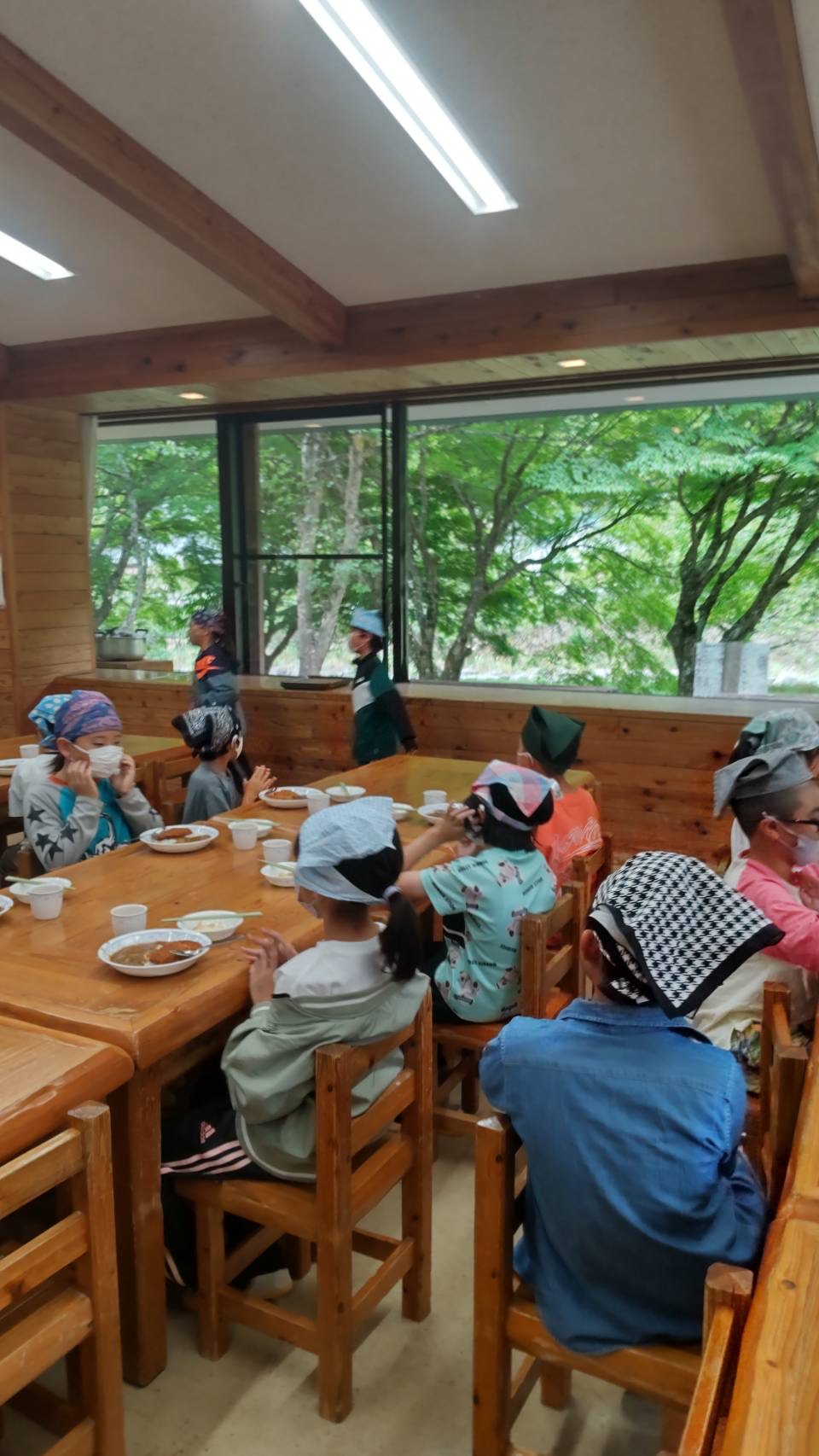 全員揃って元気に出発し、1日目の活動のあまごつかみやいのちの学習、サーチザツリーなどを体験しました。生きているあまごに串を刺すのは、怖かったりかわいそうだったりして、逡巡する気持ちがあったようです。それだけに炭火でじっくり焼いていただいたあまごの味はとても美味しかったそうで、きれいに食べられた子が多くいました。さまざまな活動を一緒にした仰木小学校の子たちと仲良くなり、夕食の時にはたくさん会話をする姿が見られました。夜のレクレーションも楽しみ、元気に1日目の活動を終えました。