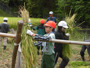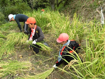 春に田植えを体験させていただいた稲が生長し、たくさんのお米を実らせていました。今日は5年生全員で、稲刈りの体験をさせていただきました。鎌で一束一束刈り取り、六束になったら稲でくくります。だんだん刈るのに慣れて、凄いスピードで刈り取りが終わりました。