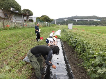 まず、マルチを敷いて、1つの穴に3粒ずつまきました。