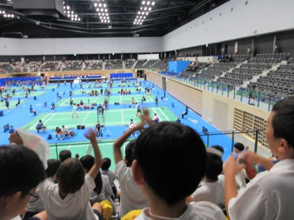 4−6年生の児童がダイハツアリーナで行われるバドミントンの試合観戦に行きました。本日は天皇皇后両陛下もお見えになるとのことで、少し緊張しながら参加しました。子どもたちは滋賀の選手に声援を送ったり、両陛下が来られると手を振ったりして、会場の雰囲気を楽しんでいました。バドミントンのシャトルを打つ鋭い音も間近で聞こえてきて、臨場感が感じられました。