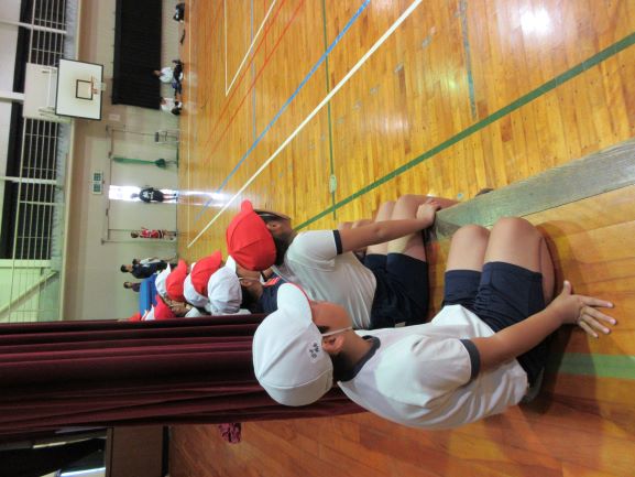 今週末の運動会に向けて応援合戦の練習を全校でしました。赤組・青組に分かれて練習した後、お互い見合いっこをしました。相手のチームにリスペクトを払いながら、自分たちのチームを盛り上げようと、応援リーダーさんを中心にエールを送り合いました。本番、どちらのチームもよい成果がでると思います。