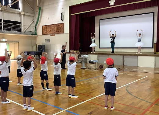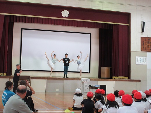 10月29日に学校巡回公演で来て下さる「バレエシャンブルウエスト」のダンサーさんが、事前のワークショップに来て下さいました。バレエってなあに?や、バレエ団の人の練習方法、基本姿勢やお辞儀の仕方等、間近で教えていただき、みんなも一緒に踊りました。