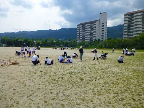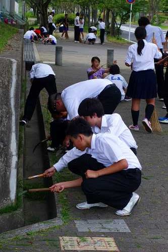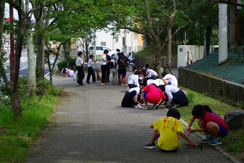 生徒会がボランティアを呼びかけ、学校近辺と敷地内のゴミ拾いや草むしりをしました。火ばさみを持ってゴミを拾う姿をカニにたとえて、かにカニ大作戦と呼ばれています。