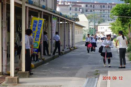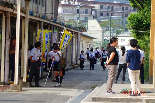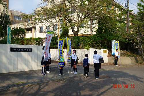 毎週月曜日の朝、挨拶運動を実施しています。挨拶をして、さわやかな1日にしましょう。