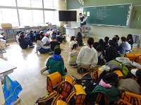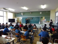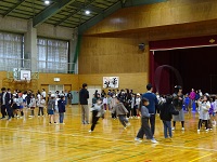 今年度、最後の木戸リンピックです。前回に続いての連続縄跳びです。当然、進行は体育委員です。ルールは簡単、たて割りで1〜3年と4〜6年に分かれての連続で何回跳べるかです。ただし、勝敗は、跳んだ回数ではなく、前回跳んだ回数と比較して増えた回数で順位が決まります。回数的には、青色チームがダントツでしたが、年間順位はすべて1点差で、優勝したのは黄色チームでした。先月行われた冬季オリンピックに負けないほどの声援が体育に響いていました。