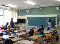 1年生の算数では「かたちづくり」の授業で、校内にある三角形や四角形の形を探しました。四角形は、黒板やTVなど見つけやすかったのですが、三角形はなかなか見つけることができません。校内をうろいろ探索しました。校舎内の廊下は寒かったですが、グラウンドは太陽の陽ざしが暖かかったです。