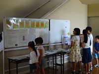 夏休みの宿題であった自由研究や作品などが、各学級で展示されています。一部は、昇降口の廊下でも紹介をしています。地元の石やちりめんモンスターの採集、スライムやシャボン玉の研究、おみくじの販売機の製作などそれぞれが時間をかけて取り組んだ作品が多く見られました。この中の一部は、大津市の作品展にも出展します。
