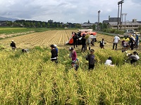 先週に予定していた5年生の稲刈りを、本日行うことができました。朝晩は秋の訪れを感じることができますが、日中はまだまだ暑い日が続いています。5月に植えたイネも育ち、今回も地域の季楽里さんらの協力でカマで刈り取った稲をすぐに脱穀していただきました。稲刈り後の田んぼに寝そべって少しだけ近づいた秋の空を感じることもできました。