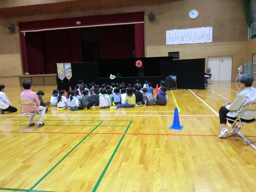 今日の2校時、1・2年生を対象に、UFOさんが人形劇をしてくださいました。体育館にて、本格的なセットや音響を用いての劇だったため、子どもたちは集中して楽しんでいる様子でした。
