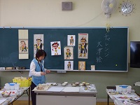 特別支援学級の授業で、大津絵の講師の方にご来校いただき、大津絵にチャレンジしました。大津絵とは、人物や動物をユーモラスなタッチで描いた絵画です。「藤娘」や「釣鐘弁慶」などが有名です。今回は、これもよく知られている「鬼の念仏」に挑戦しました。ユーモラスな表現が大切なので、それぞれが自由に描きました。自由で楽しい大津絵が完成しました。