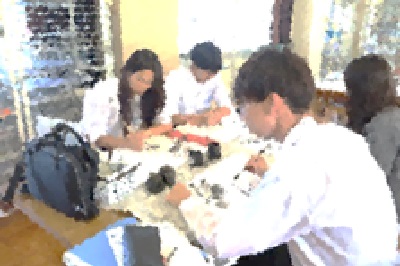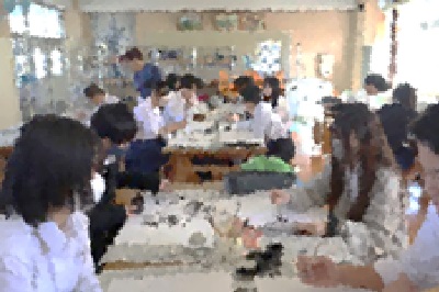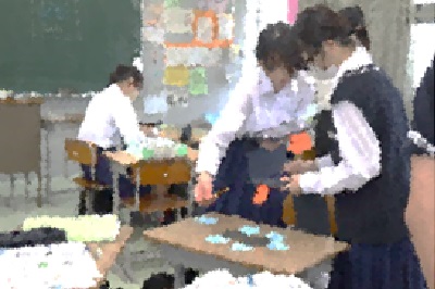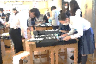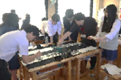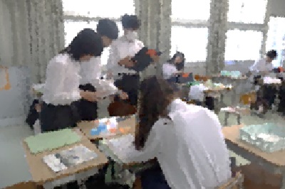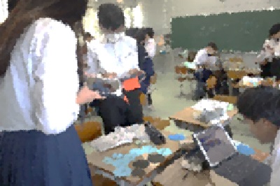 2年生理科の授業では、分子の模型カードを使って、分子を組み立てていました。机の上で組み立てて、いろんな化学式を考えていました。できあがった分子のモデルをタブレットにたくさん保存できました。
