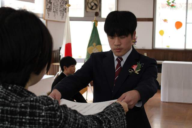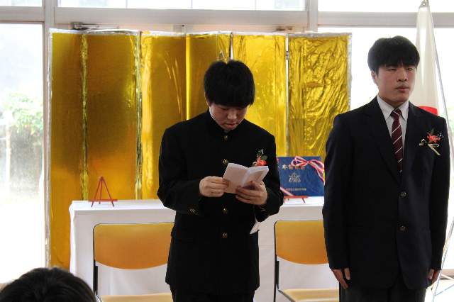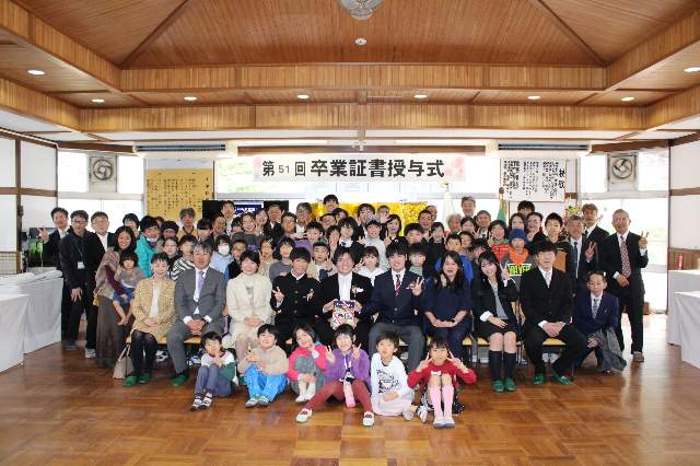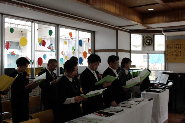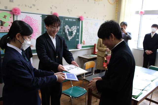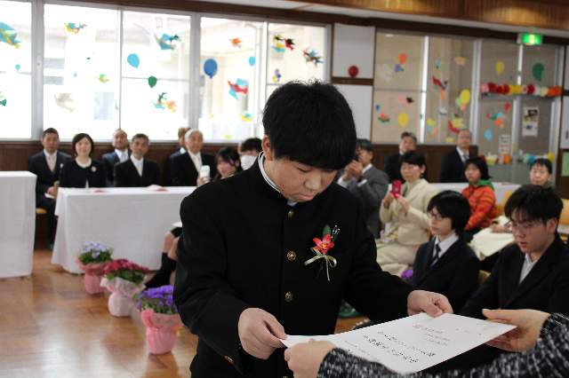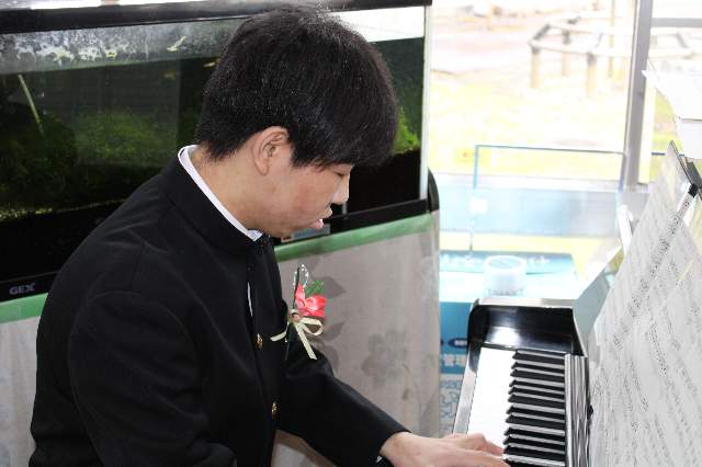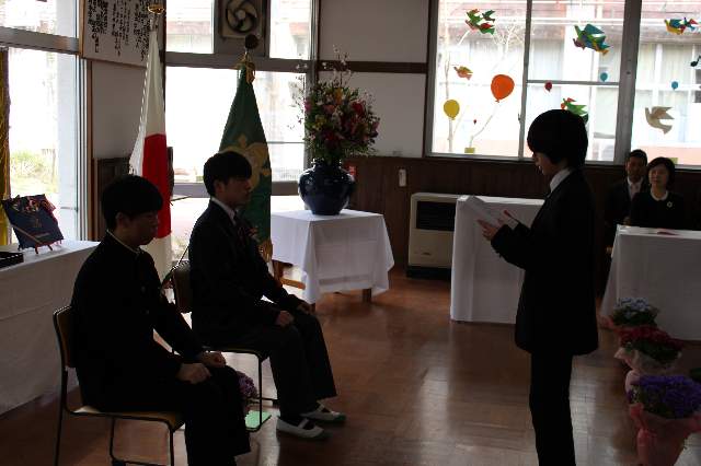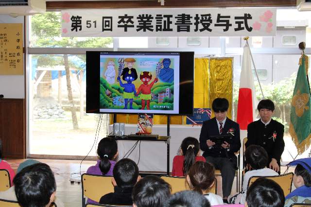 卒業生が校歌の伴奏をして、式後にはKCL活動で制作した絵本「葛川の太鼓廻し」を小中学生に読み聞かせをしました。