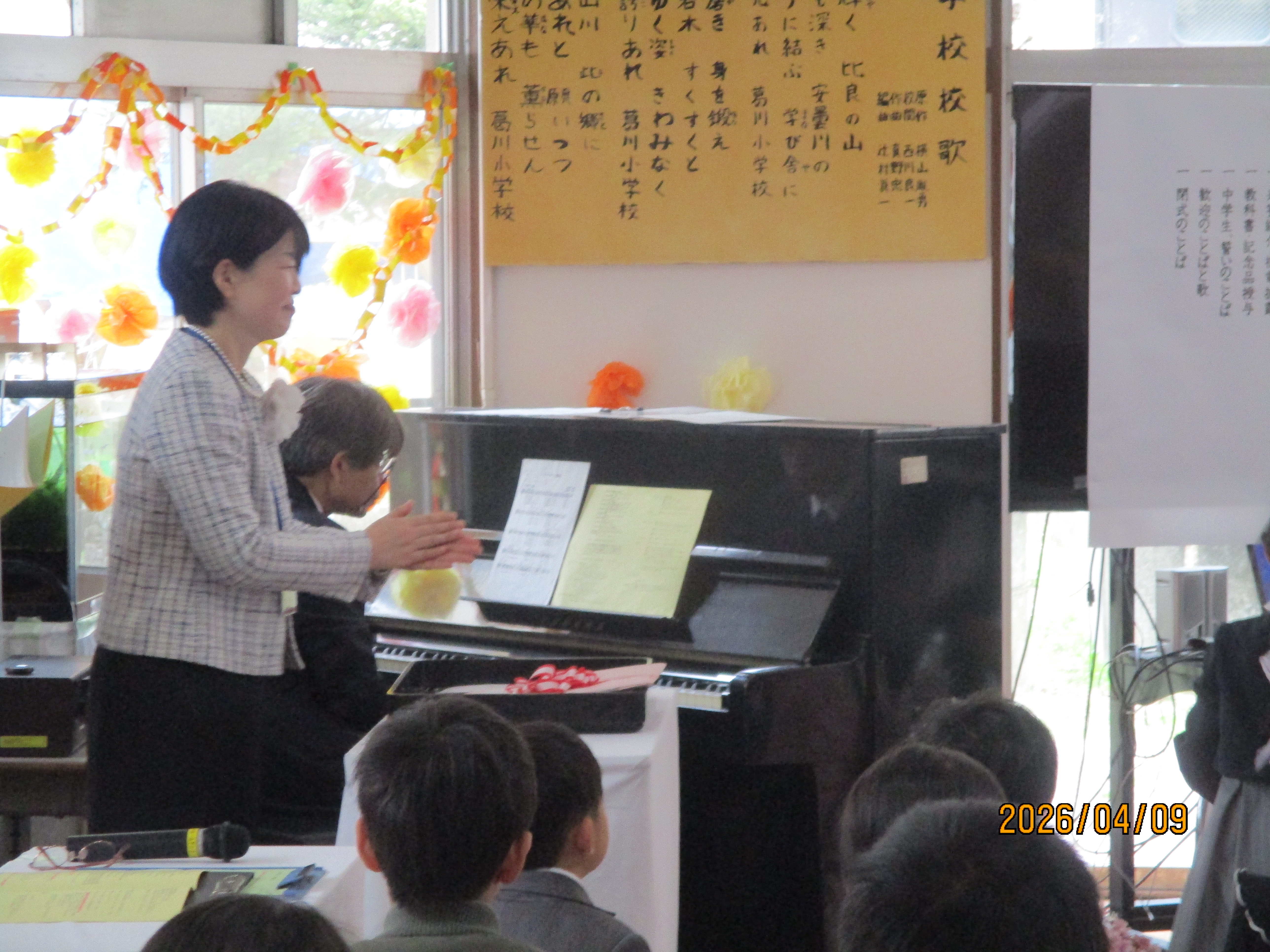 卒業生が校歌の伴奏をして、式後にはKCL活動で制作した絵本「葛川の太鼓廻し」を小中学生に読み聞かせをしました。