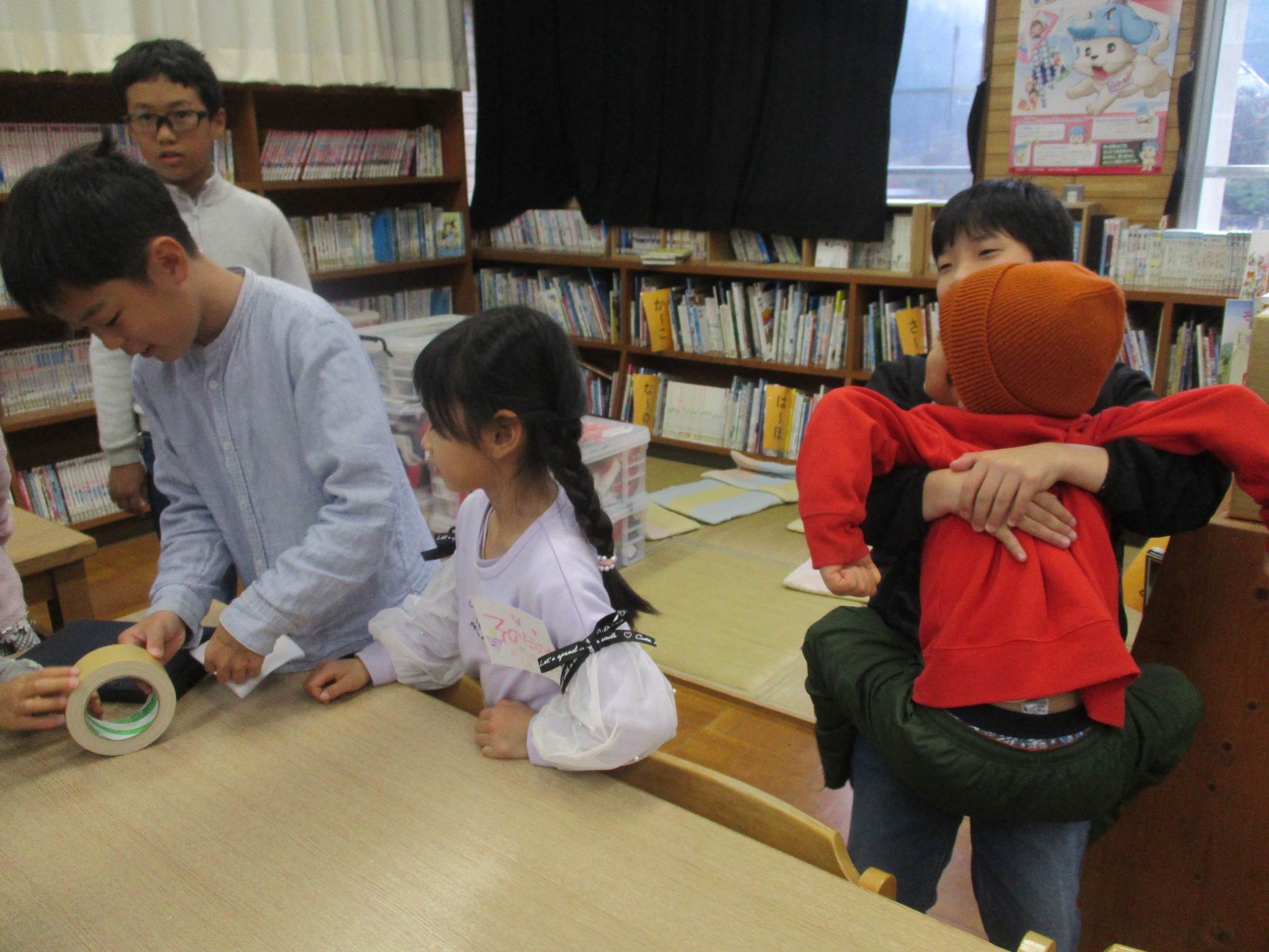 5歳児と5年生が交流しました。来年度1年生になる学年と、6年生になる学年です。