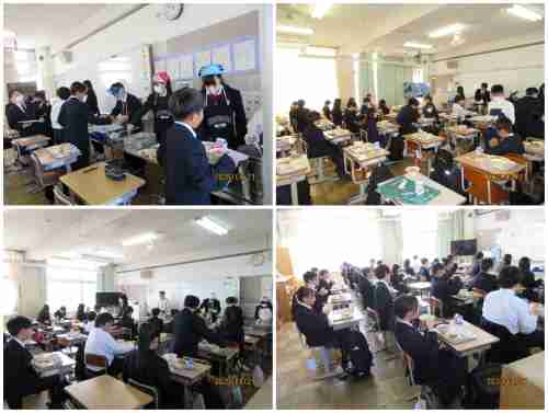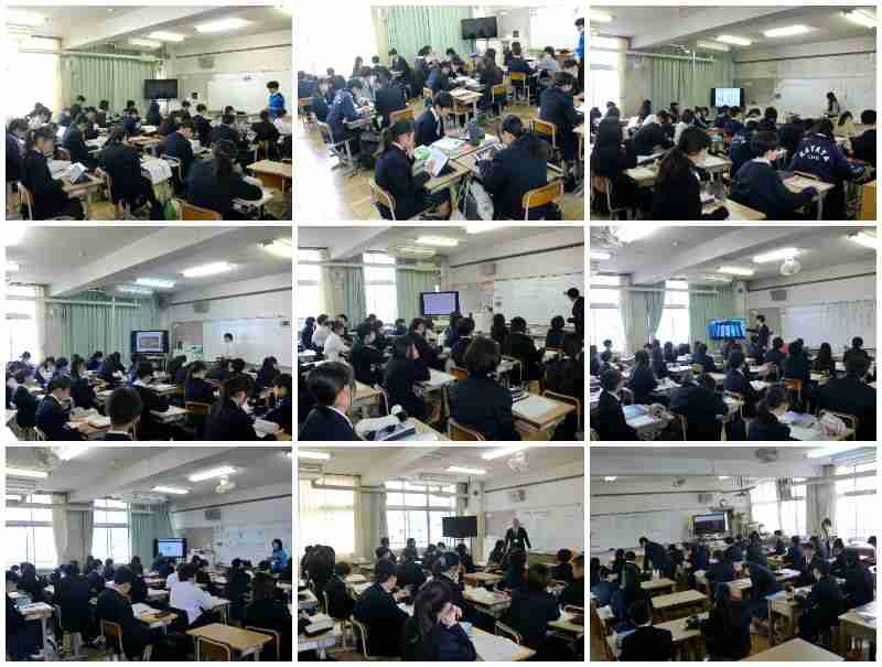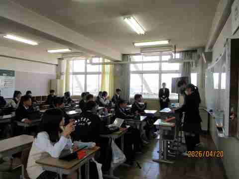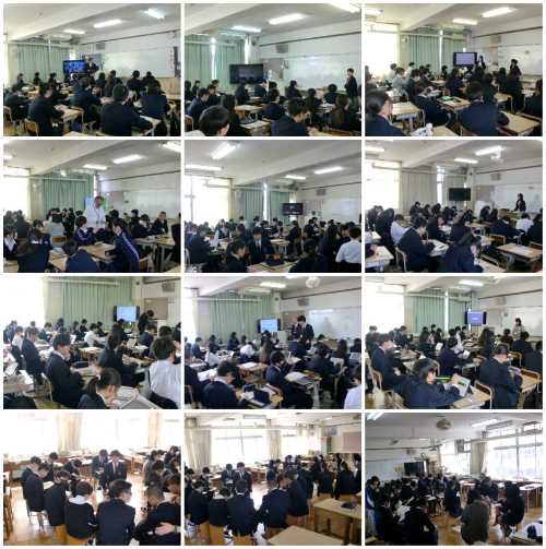 1時間目の授業の様子です。10組・11組・12組では英語の授業が行われ、今日から堅田中学校に赴任されたALTの先生がテレビ画面を使って英語で自己紹介をされました。生徒たちは興味深そうに耳を傾けていました。